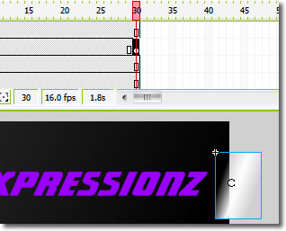 Step 4 : On the gradient layer select frame 30 and press F6 to insert a keyframe.' Extend the timelines for the other layers by selecting each layer, selecting frame 30 and hitting F5 to insert a frame. Position the gradient in the 30th frame and move it to the right side of the text. [Press Shift + RightArrow to move it quickly]. Then click any frame between them, right click and select 'Create Motion tween'.